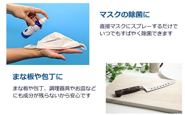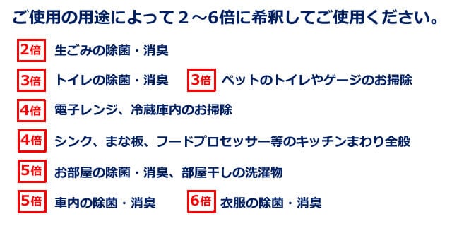 食品添加物でありながら、除菌・消臭力が高い次亜塩素酸で生成した除菌・消臭ウォーターです。目に見えないウイルスやダニやガビ、生ゴミなどの臭いが気になる場所に噴霧するだけですばやく除菌・消臭します。用途に合わせて希釈してご使用いただけるのでとても経済的です。